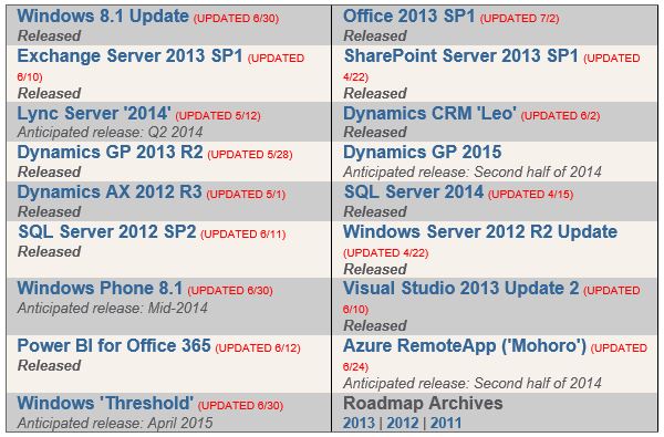 Según Redmond Channel Partner es el estado de liberación de las siguientes versiones.