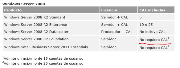 Utilizando cualquier buscador se puede validar que Windows Server Foundation no requiere CAL . Ver: http://www.microsoft.com/OEM/es/licensing/productlicensing/Pages/server-cal.aspx#fbid=4R-J3FvueCp