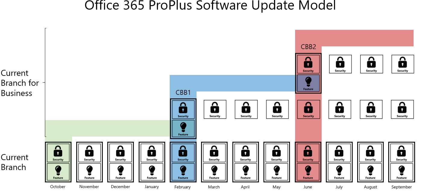 - “Rama actual de negocios” se actualizará cada cuatro meses y será soportado en Office Pro Plus y Office planes E3/E4/E5. Los clientes de “rama actual de negocios” podrán saltar una actualización pero no podrán tener un desfase mayor a 8 meses o no recibirán actualizaciones de seguridad. Ver abajo