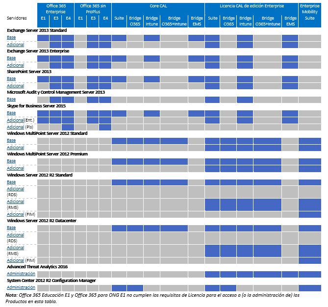 Los derechos de acceso al software de servidor que se ejecuta en Servidores bajo Licencia del Cliente o para Administrar OSE están disponibles en CAL Suites y SL de los Servicios en Línea. Si en el cuadro de abajo (tomado del documento Términos de Producto de este mes) una celda está a sombreada con azul en una fila de servidor, la CAL Suite o SL en esa columna satisface el requisito de Licencia para el acceso a (o la administración de) funciones de base o adicionales de esa base de ese Producto de Servidor. Es decir, puede saber sí una CAL Suite o un servicio en línea por usuario (USL) cubre el acceso a un servicio local de un servidor determinado.