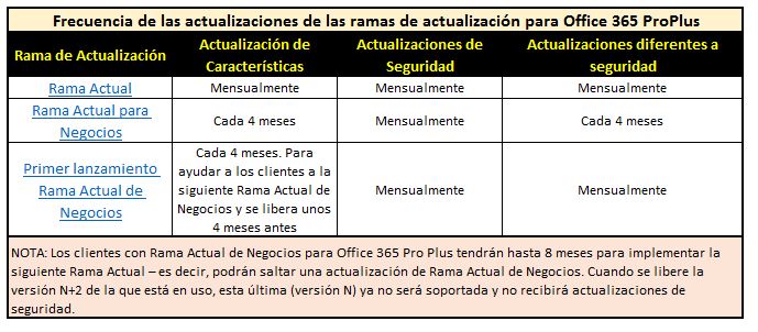 En cuanto a Office 365 Pro Plus estas son las frecuencias de actualización: