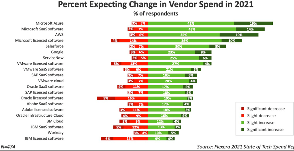 • Los encuestados también esperan aumentar el gasto en AWS, Salesforce, Google y otras soluciones en la nube.