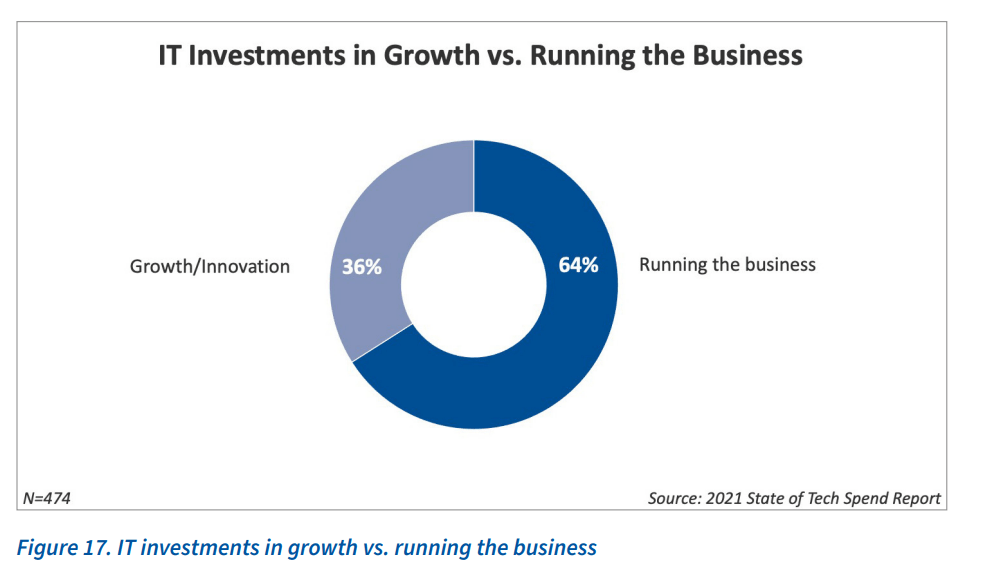 • Las organizaciones están asignando el 64 por ciento del gasto en TI a la gestión del negocio y el 36 por ciento al crecimiento y la innovación.
