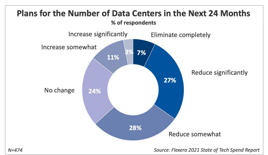 • El 62 por ciento de los encuestados reducirá el uso de los centros de datos en los próximos 24 meses, con el 27 por ciento planeando reducciones significativas en el uso del centro de datos y el siete por ciento planeando eliminarlos por completo.
