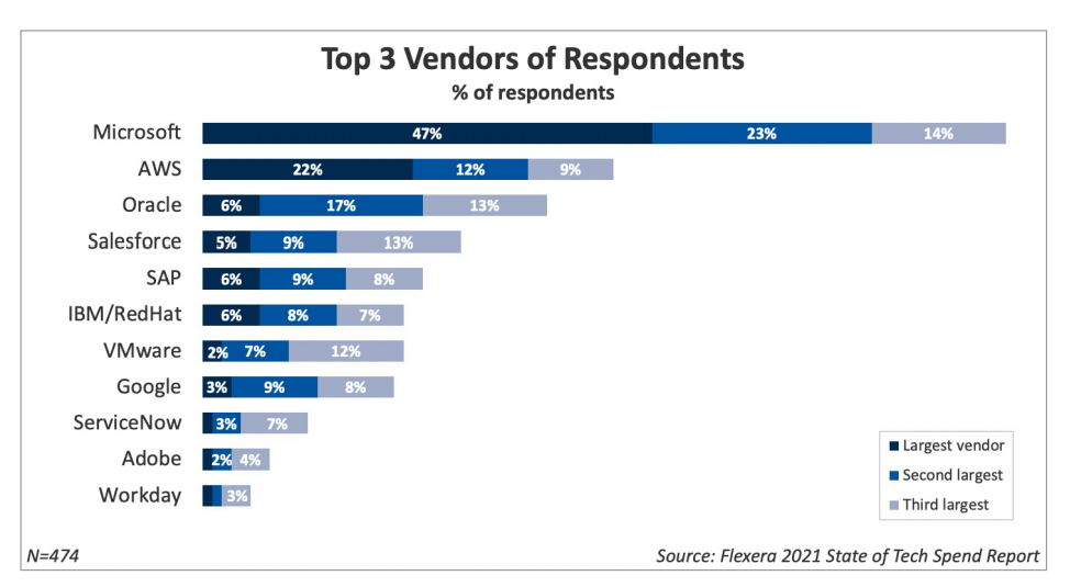 • Microsoft continúa dominando, con el 84 por ciento de los encuestados clasificándolo como uno de los tres principales proveedores por gasto