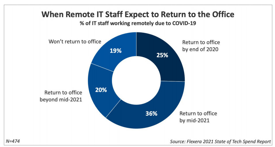 • Una quinta parte de los empleados de TI que pasaron a trabajar desde casa seguirán siendo trabajadores remotos de forma permanente en lugar de regresar a la oficina.