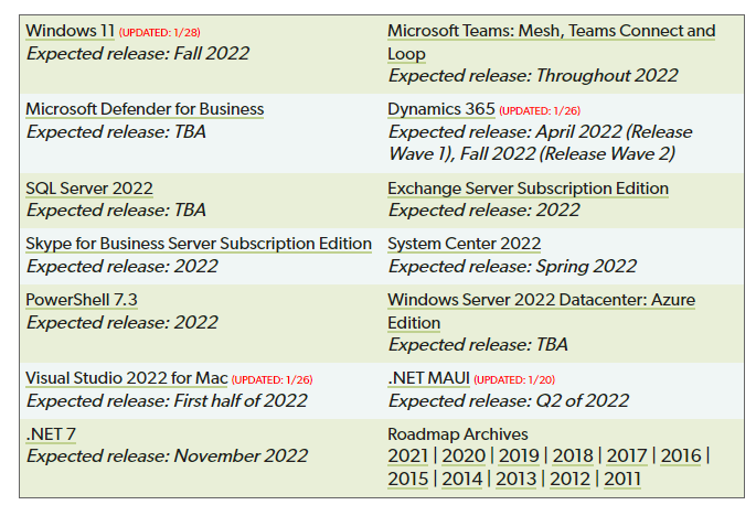 Redmond Channel Partner publica periódicamente la hoja de ruta de los productos Microsoft para el año en curso, A continuation se presenta la última actualización. Mayores detalles acá.